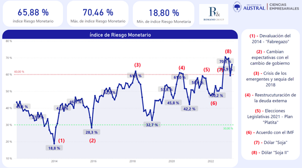 | Sobre el Índice de Riesgo MonetarioEste es un índice de actualización mensual, cuyo mes y año de base es octubre de 2010, con estadísticas oficiales del INDEC y el BCRA. Se construye a partir de distintas variables económicas en términos locales y globales, consideradas “imprescindibles” para mantener la estabilidad monetaria de la economía doméstica:Pasivos remunerados (Leliq, pases, lebac)Base monetaria respecto al PIBPasivos remunerados respecto al PIBPasivos remunerados respecto a la base monetariaRiesgo país y comparativo contra economías emergentesReservas internacionales brutasSaldo balanza comercial mensual (Exportaciones e Importaciones)Tipo de cambio oficialTasas de interés realInflaciónPBIUn índice por debajo del 30% resulta ser un escenario de estabilidad monetaria, mientras que un índice superior al 60% evidencia un escenario de altísima fragilidad monetaria. |