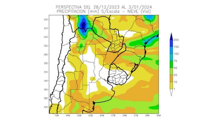 La mayor parte del área agrícola uruguaya, gran parte del área agrícola paraguaya y gran parte del área agrícola argentina observarán precipitaciones escasas (menos de 10 mm) con amplios focos con valores moderados y otros abundantes.