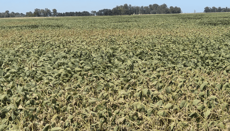 Soja con problemas de estrés debido a la ola de calor, en Carlos Tejedor, Buenos Aires (Imagen de @FranMendiverri)