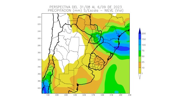 No obstante, ni Santa Rosa logra activar las lluvias: en general, se prevén precipitaciones predominantemente escasas a nulas, salvo focos de tormentas sobre la Cordillera Sur y Central, algunas lluvias moderadas en el este de La Pampa y Buenos Aires; y un foco de tormentas sobre Misiones.