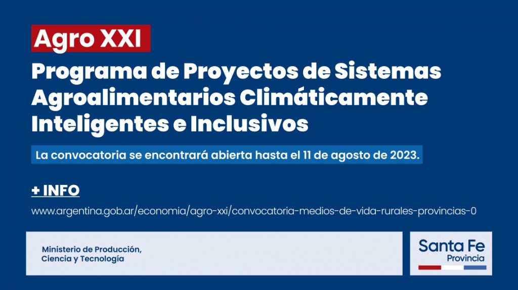 El Ministerio de Producción, Ciencia y Tecnología, a través de la secretaría de Desarrollo Territorial y Arraigo, impulsa el Programa Nacional de Proyectos de Sistemas Agroalimentarios Climáticamente Inteligentes e Inclusivos (Agro XXI), que prevé la entrega de aportes para emprendimientos vinculados a la agricultura familiar en todo el territorio provincial.