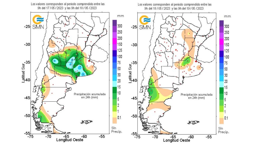 Los mapas que elabora diariamente el Servicio Meteorológico Nacional (SMN) muestran que, desde las precipitaciones del 17 de mayo pasado, se han registrado importantes acumulados fundamentalmente en Buenos Aires, pero también en La Pampa, Córdoba, Santa Fe, Entre Ríos, Chaco, Corrientes, Formosa y Santiago del Estero.