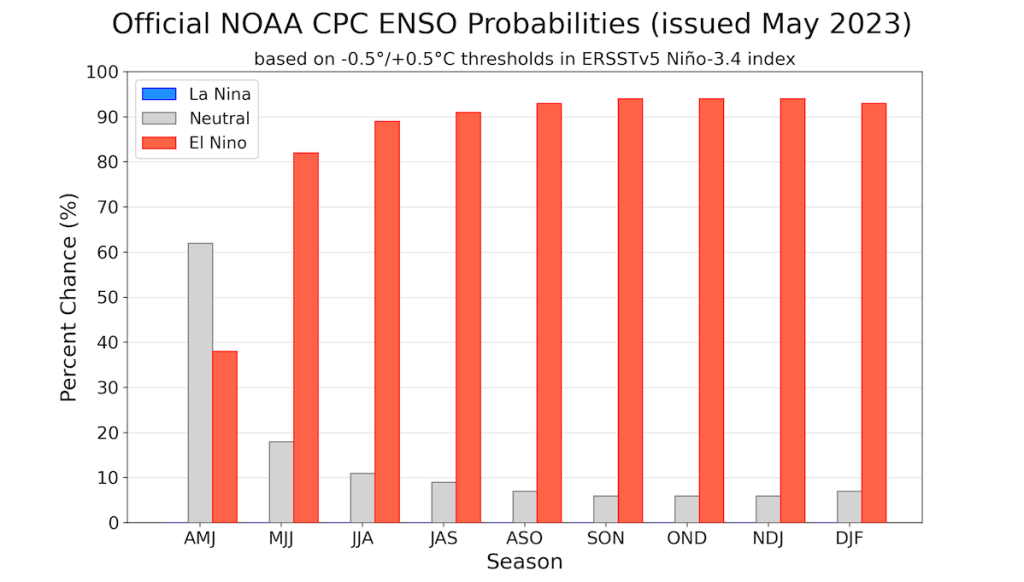 De acuerdo con el último informe del Instituto Internacional de Investigación del Clima y la Sociedad de la Universidad de Columbia, uno de los organismos más prestigiosos en la materia, la probabilidad de El Niño escala a partir de junio y supera el 90% a lo largo del segundo semestre.