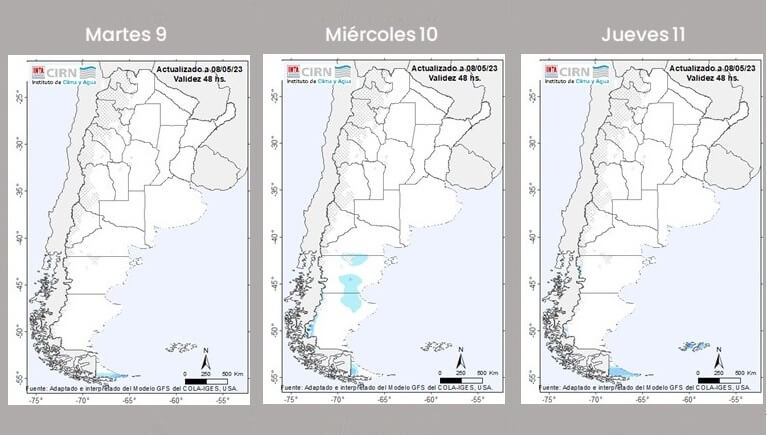 Los pronósticos del Instituto de Clima y Agua del INTA y de la Oficina de Riesgo Agropecuario muestran que no se prevén precipitaciones, salvo en algunas zonas de la Patagonia.