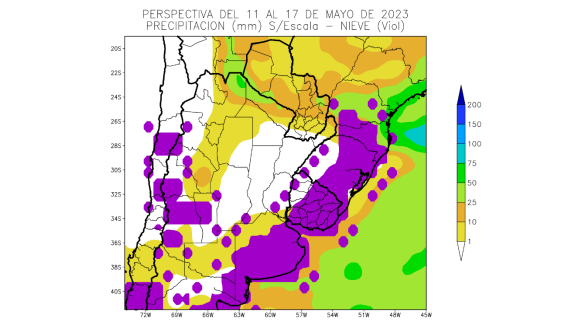 Junto con este frente de tormenta, se generarían algunas precipitaciones, pero predominantemente escasas, salvo algunos focos sobre el extremo norte del área agrícola.