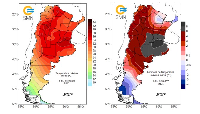 De esta manera, la mayor parte del área agrícola observará temperaturas máximas superiores a 30°C con focos aislados superiores a 35°C y otros focos con valores inferiores.